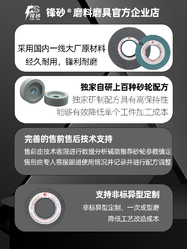 1、磨料:棕剛玉(A)、白剛玉(WA)、鉻剛玉 (PA)、綠碳化硅(GC)、黑碳化硅(C)等。